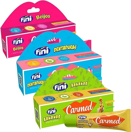Este kit contém: 1 Hidratante Labial Carmed Fini Beijos 10g 1 Hidratante Labial Carmed Fini Bananas 10g 1 Hidratante Labial Carmed Fini Dentaduras 10g Para compra unitária, favor acessar a loja ou pedir o link no chat. Hidratante labial de uso diário com aroma de Carmed Fini com alto poder de hidratação, protege contra o ressecamento, deixando os lábios macios e saudáveis. Sem parabenos e conservantes; Não testado em animais; Pode ser usado a partir de 3 anos. Hidratante labial em bisnaga.